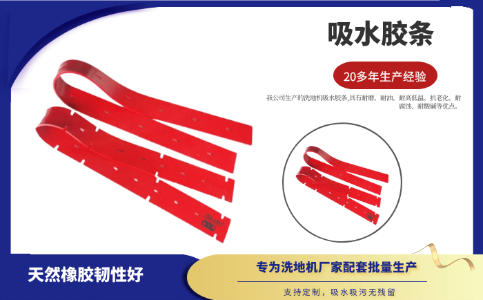 產(chǎn)品說明:吸水膠條是洗地機吸水扒上的重要部件,作用就是與地面接觸,產(chǎn)生一個密封的空間,把地面上的污水通過風(fēng)機進(jìn)行回收。吸水膠條一般分為耐油型(進(jìn)口PU原料)和普通型(進(jìn)口NR原料)兩種。