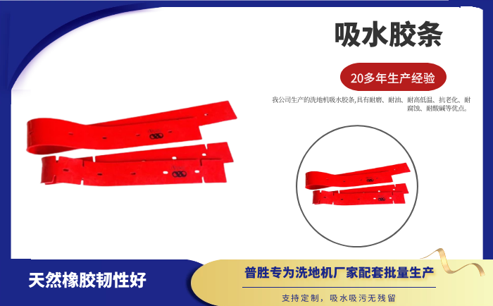 產(chǎn)品說明:吸水膠條是洗地機(jī)吸水扒上的重要部件,作用就是與地面接觸,產(chǎn)生一個密封的空間,把地面上的污水通過風(fēng)機(jī)進(jìn)行回收。吸水膠條一般分為耐油型(進(jìn)口PU原料)和普通型(進(jìn)口NR原料)兩種。